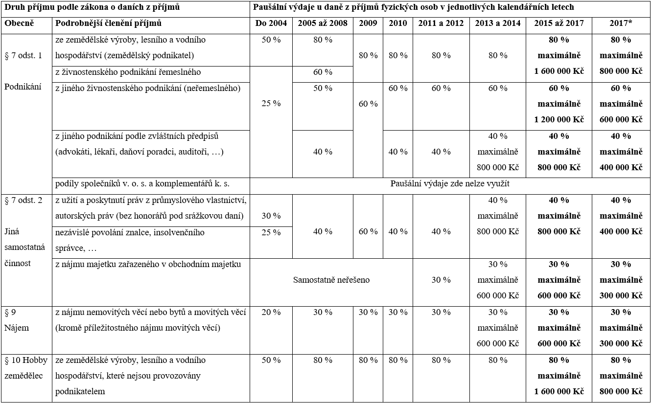 Výše paušálních výdajů stanovená v § 7 odst. 7 a § 9 odst. 4 ZDP se měnila a od roku 2013 byly zavedeny (postupně) maximální absolutní částky paušálních výdajů, jak shrnuje tabulka níže. Poslední sloupec (2017*) je zatím s otazníkem, protože příslušná novela ZDP (sněmovní tisk č. 873) ještě čeká na projednání v Senátu, přičemž by mělo jít o možnou, nikoli povinnou variantu roku 2017.