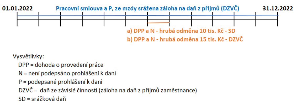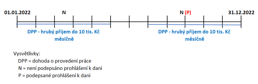 Při tomto konkrétním zadání (dvě dohody o provedení práce u dvou různých zaměstnavatelů s měsíční odměnou do 10 tis. Kč měsíčně) by bylo možné i požádat posledního zaměstnavatele v roce 2022 o roční zúčtování. Zaměstnanec by musel u posledního zaměstnavatele do 15. 2. 2023 podepsat dodatečně prohlášení k dani za rok 2022 (za měsíce, po které byl u něj zaměstnán) v souladu s § 38k odst. 7 ZDP (na časové ose P v závorce). Tento postup v naší konkrétní situaci by však nebyl pro zaměstnance výhodný, neboť ročnímu zúčtování by podlehly pouze příjmy od posledního zaměstnavatele v roce 2022, a zaměstnanci by tak byla vrácena pouze daň sražená z příjmů vyplacených tímto zaměstnavatelem. Vrácení srážkové daně z příjmů na základě dohody o provedení práce u prvního zaměstnavatele v roce 2022 by nebylo možné.