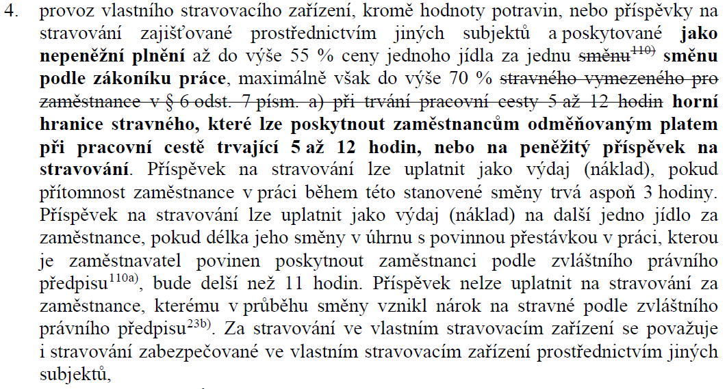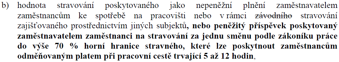 V případě použití nepeněžního příspěvku (stravenky) platí stávající úprava, tj. daňovým nákladem zaměstnavatele je 55 % hodnoty stravenky maximálně do výše 70 % stravného zaměstnanců odměňovaných platem při pracovní cestě trvající 5 až 12 hodin, tedy výše zmíněných 72,10 Kč pro rok 2020. U zaměstnance je nepeněžní stravování na pracovišti (stravenka) osvobozeno od daně z příjmů bez limitu.