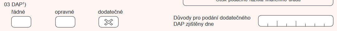 V případě, že nestihneme lhůtu pro podání opravného přiznání, podáváme v případě potřeby „opravy“ přiznání dodatečné. Že se jedná o přiznání dodatečné, označíme na ř. 3 a doplníme datum, kdy jsme zjistili důvody pro podání tohoto dodatečného přiznání.