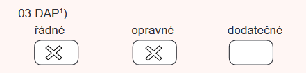 Opravné daňové přiznání je možné podat před uplynutím lhůty pro podání řádného přiznání. Na ř. 03 přiznání v tomto případě označíme křížkem obě možnosti „řádné DAP“ (DAP = daňové přiznání) i „opravné DAP“.