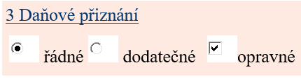 - Podáváme opravné přiznání nahrazující dodatečné přiznání – zůstane tedy nezaškrtnuto „dodatečné“ a „opravné“, paradoxně tak musíme zaškrtnout pouze „řádné“.