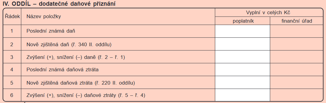 Daňové přiznání kompletně vyplníme – do všech kolonek (řádků) vyplňujeme „nové“ hodnoty, a navíc vyplníme i oddíl IV. „dodatečné daňové přiznání“.