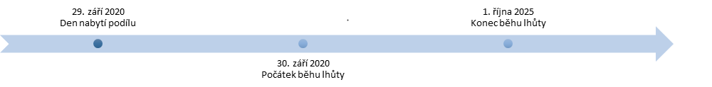 Představme si, že tu máme fyzickou osobu, která založila společnost s ručením omezeným, společnost byla zapsána do obchodního rejstříku dne 29. září 2020. Lhůta pro osvobození příjmu z úplatného převodu tohoto podílu počne běžet dne 30. září 2020, tedy den následující po dni, kdy byl podíl nabyt.