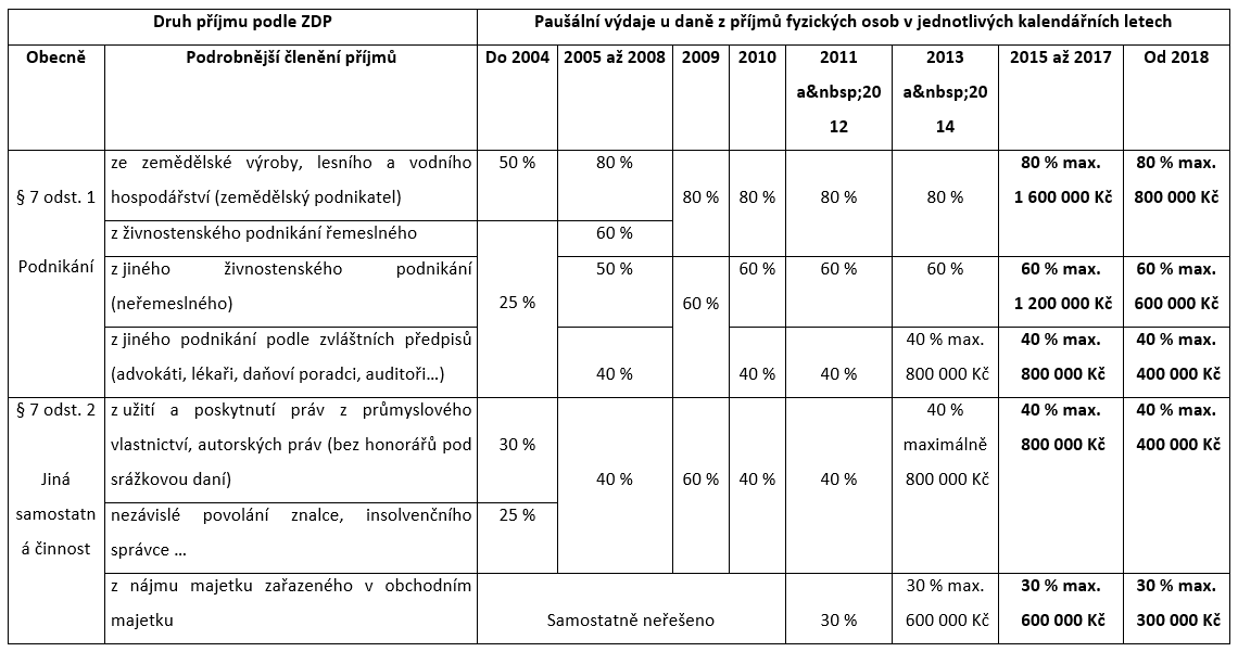 Výše paušálních výdajů OSVČ stanovená v § 7 odst. 7 ZDP se měnila a od roku 2013 byly zavedeny (postupně) maximální absolutní částky paušálních výdajů, jak přehledně shrnuje tabulka. Zdůrazněme, že tato limitace, slangově přezdívaná „stropy“ paušálních výdajů rozhodně neznamená zákaz uplatnění paušálních výdajů pro více vydělávající OSVČ, takoví poplatníci se pak ale musejí smířit s tím, že kvůli snížení „stropů“ budou jejich paušální výdaje de facto odpovídat nižšímu procentu z příjmů.