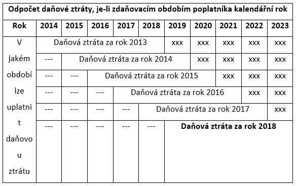 - Musí jít o pět zdaňovacích období následujících bezprostředně po zdaňovacím období, za které daňová ztráta vznikla. Poplatník si proto nemůže vybrat, že např. pětileté období pro uplatnění ztráty za rok 2018 začne počítat až od roku 2022 a ani, že ji uplatní pouze v sudých letech 2020, 2022, 2024, 2026 a 2028 apod.