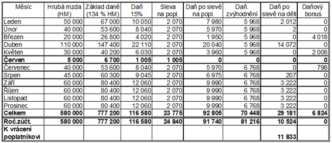 Na obrázku (Obr.) jsou zvýrazněny údaje za červen. Daňové zvýhodnění za toto období nebylo možné uplatnit formou slevy na dani. Z důvodu nízké úrovně hrubé mzdy totiž nebyla zcela využita ani sleva na poplatníka. Poplatníkovi však nemohl být za červen vyplacen ani měsíční daňový bonus, neboť úroveň hrubé mzdy byla nižší než 5 500 Kč (polovina minimální mzdy platné pro rok 2017).
