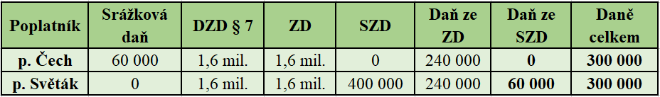 | Poplatník | Srážková daň | DZD § 7 ZDP | DZD § 8 ZDP | Základ daně | Daň ze ZD | Daně celkem |
