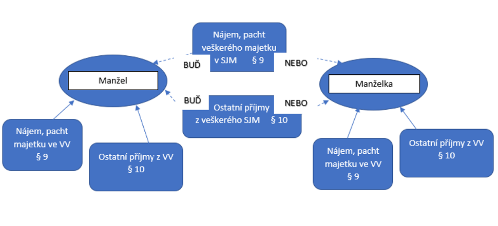 Pohybujeme se v rámci zákona o daních z příjmů (dále jen „ZDP“) v dani z příjmů fyzických osob, v kategorii příjmů podle § 9 (příjmy z nájmu a pachtu) a § 10 (ostatní příjmy). Nezabýváme se zde situací, kdy byl nebo stále je majetek v SJM vložen do obchodního majetku (§ 4 odst. 4 ZDP).