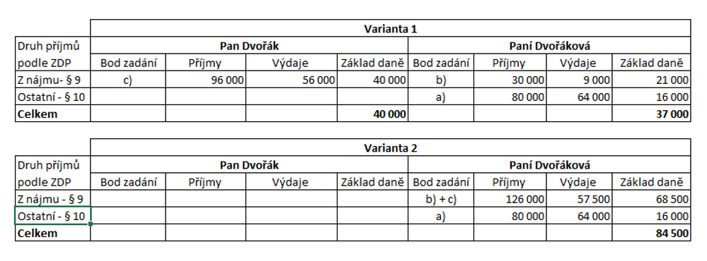 Varianta 1 obsahuje řešení, kdy příjem z nájmu bytu zdaní pan Dvořák, zatímco ostatní příjmy paní Dvořáková. V tomto případě by bylo výhodné, kdyby pan Dvořák k příjmu z nájmu uplatnil výdaje v prokázané výši, zatímco paní Dvořáková u příjmů z pachtu polí stanoví výdaje ve výši 30 % z příjmů. Celkový základ daně z těchto příjmů za oba manžele činí 77 000 Kč.