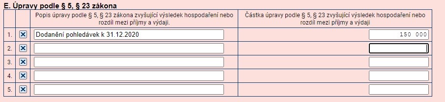 Z výše uvedených pohledávek není třeba dodaňovat pouze pohledávku 5 000 Kč za dlužníkem, který zemřel. Všechny ostatní je potřeba zdanit, tj. 100 000 + 20 000 + 30 000 = 150 000 Kč. Částku 150 000 Kč pan Novák uvede v dodatečném přiznání za rok 2020 v Příloze č. 1 do tabulky E jako položku zvyšující základ daně a dále do ř. 105. K dodaňovaným pohledávkám nelze uplatňovat paušální výdaje – nejde o příjem, ale o úpravu základu daně. Daň z pohledávek 150 000 Kč + 15 % = 22 500 Kč.