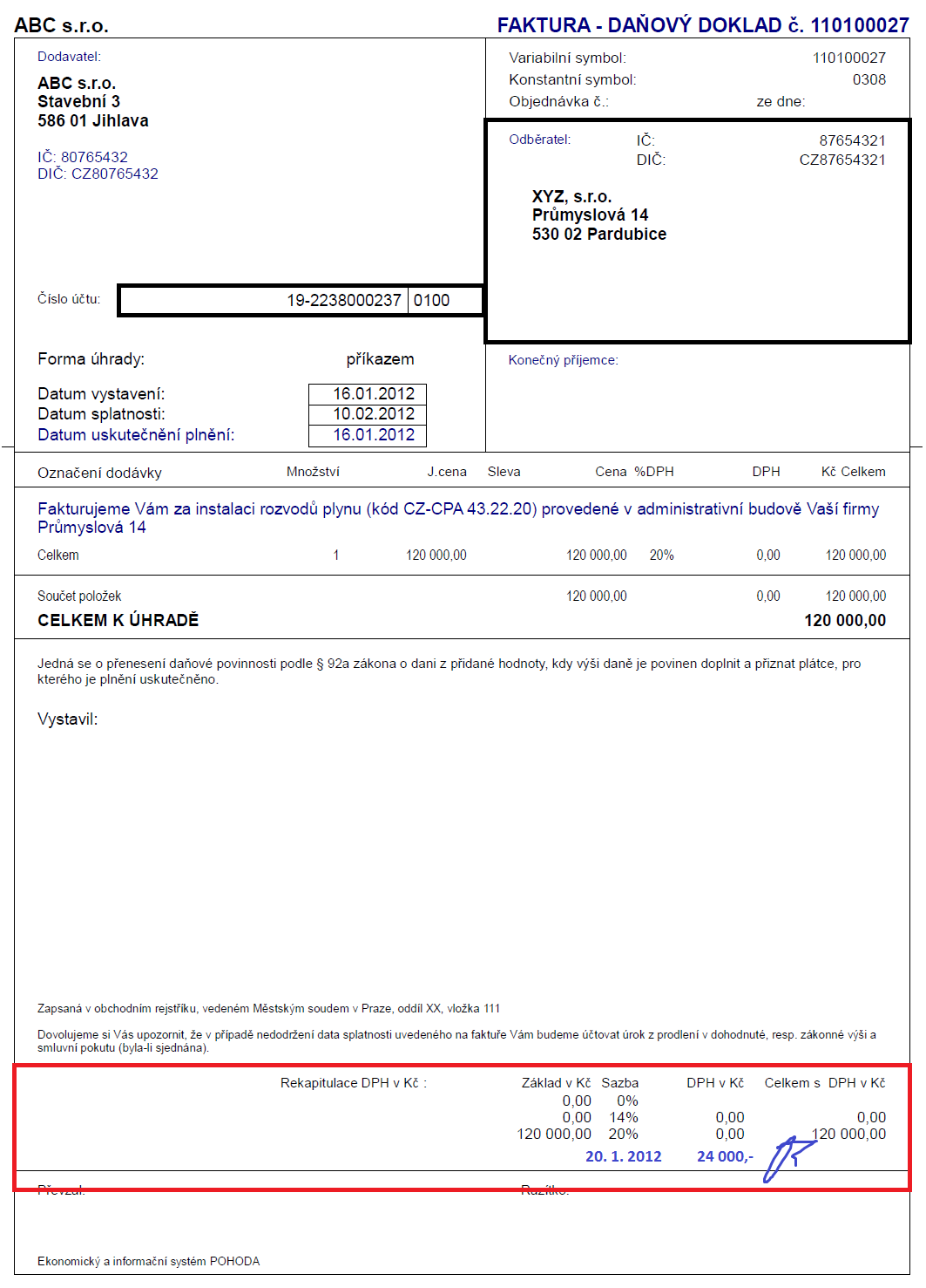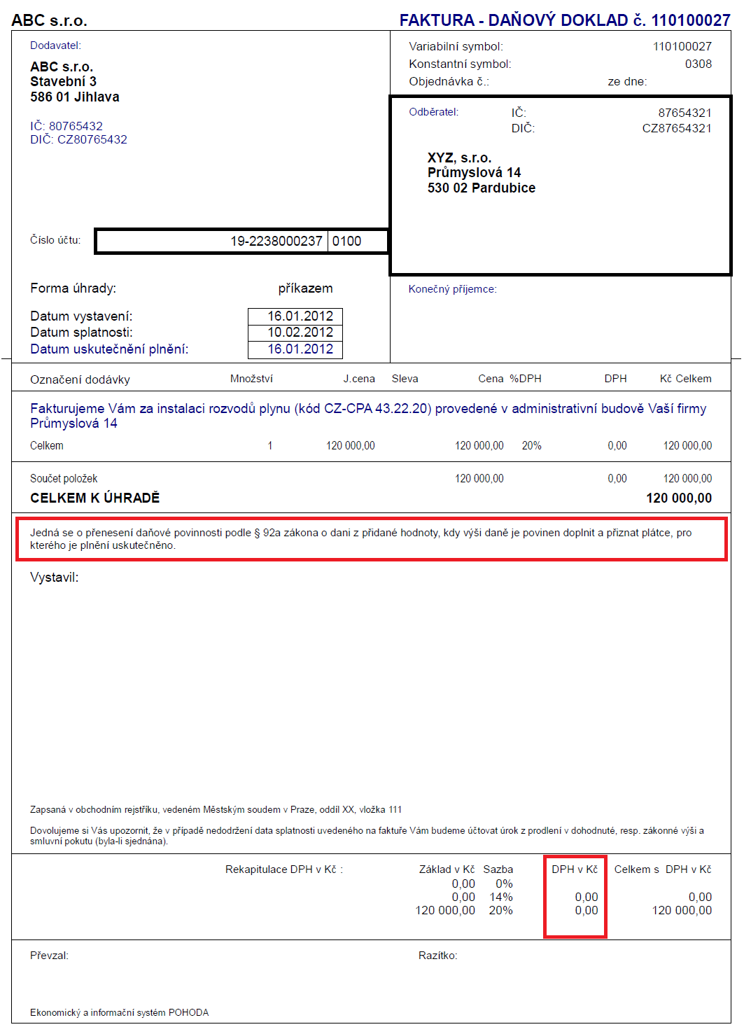 Firma ABC, s.r.o. (plátce DPH) bude instalovat firmě XYZ, s.r.o. (plátce DPH) rozvody plynu, smluvní cena zakázky činí 120 000 Kč. Jak bude vypadat faktura – daňový doklad? A jak se režim promítne v daňovém přiznání k DPH?