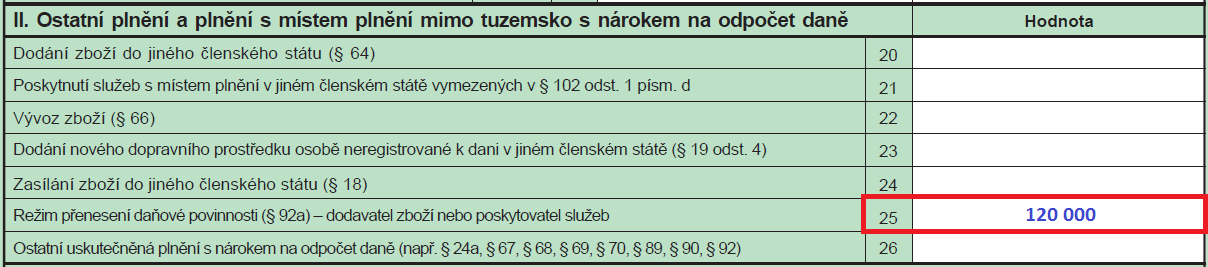 Dodavatel (firma ABC s.r.o.) vystaví fakturu, na které nebude vyčísleno DPH. Na faktuře bude zobrazena celková částka k úhradě 120 000 Kč. Při vystavování faktury vybere členění DPH se zkratkou UDpdp4. Na faktuře se automaticky objeví informace o tom, že výši DPH je povinen doplnit a přiznat příjemce plnění, a do přiznání k DPH vstoupí částka 120 000 Kč na řádek 25.