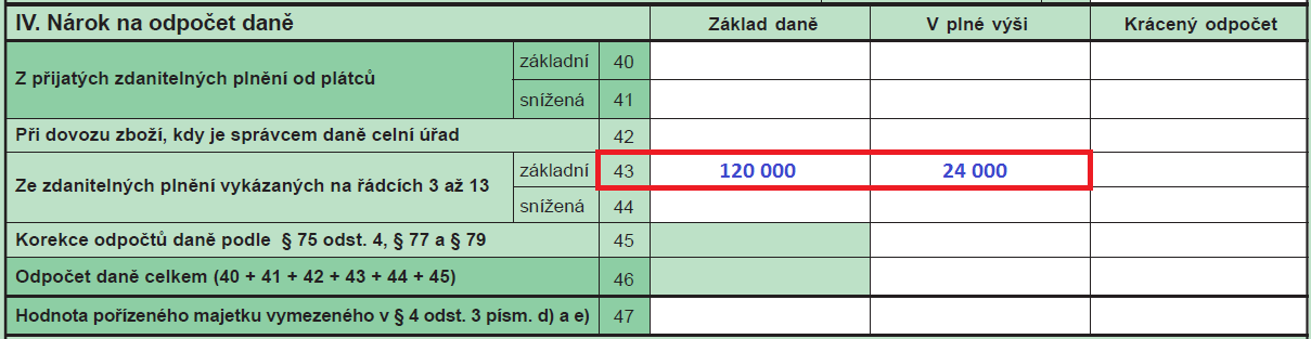 - druhým nárokuje odpočet – členění DPH se zkratkou PDpdp zařadí obě částky na řádek 43.