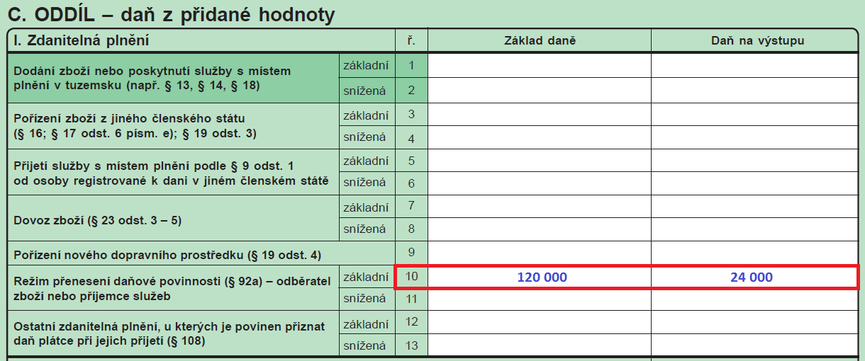 - jedním odběratel DPH přizná – členění DPH se zkratkou DDpdp4 zařadí základ daně 120 000 Kč a daň ve výši 24 000 Kč do přiznání k DPH na řádek 10,