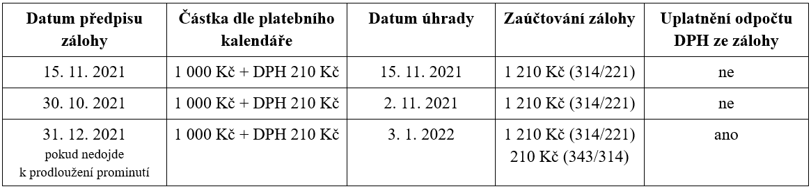 - platební kalendáře (případně daňové doklady) vystavené před 1. 11. 2021 zůstávají nadále platné; v období 1. 11. až 31. 12. 2021 se k nim bude přistupovat tak, že budou považovány za předpis k úhradě, přičemž odběratel nebude mít nárok na odpočet DPH z dokladů za rozhodné období, současně celá úhrada zálohy bude započítána při vyúčtování do základu daně – bude se tedy k záloze přistupovat, jako by celá úhrada byla s nulovou sazbou DPH,