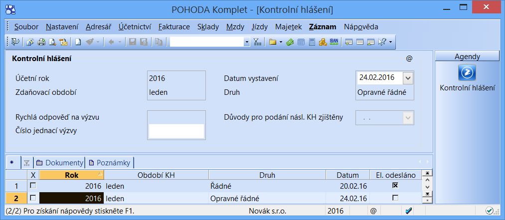 Doklady, které do kontrolního hlášení vstupují, najdete v agendě Položky kontrolního hlášení. Tuto agendu otevřete z vytvořeného záznamu kontrolního hlášení pro příslušné období dvojklikem myši, klávesou ENTER nebo pomocí místní nabídky vyvolané pravým tlačítkem myši a zvolením povelu Otevřít hlášení. V agendě naleznete také stejnojmennou tiskovou sestavu.