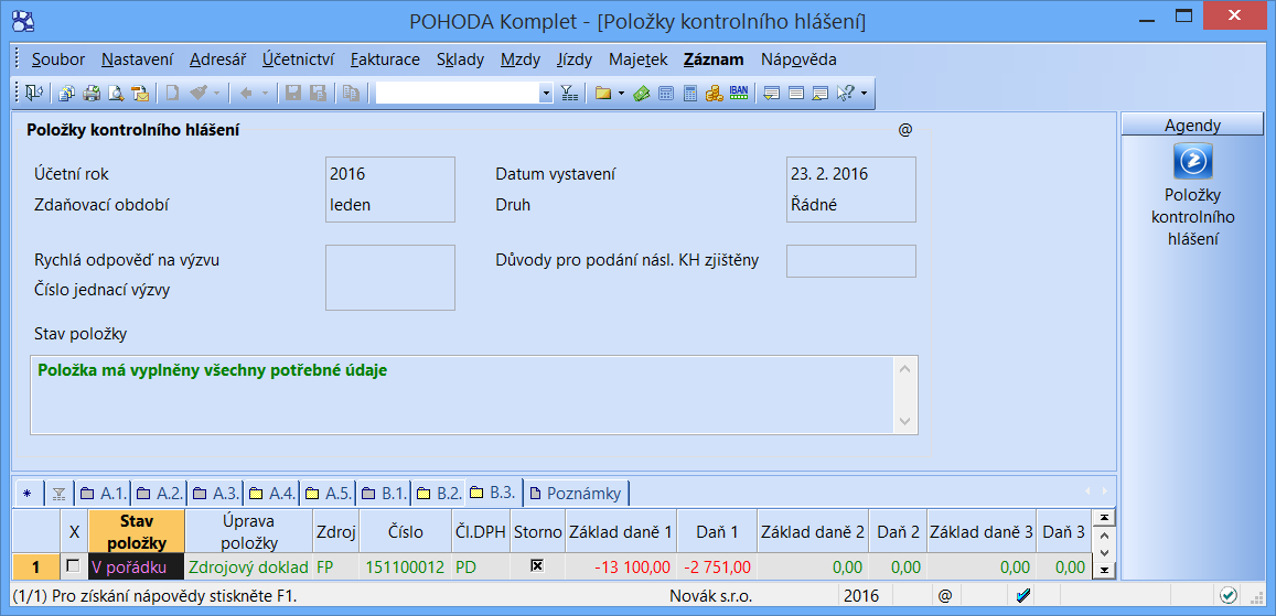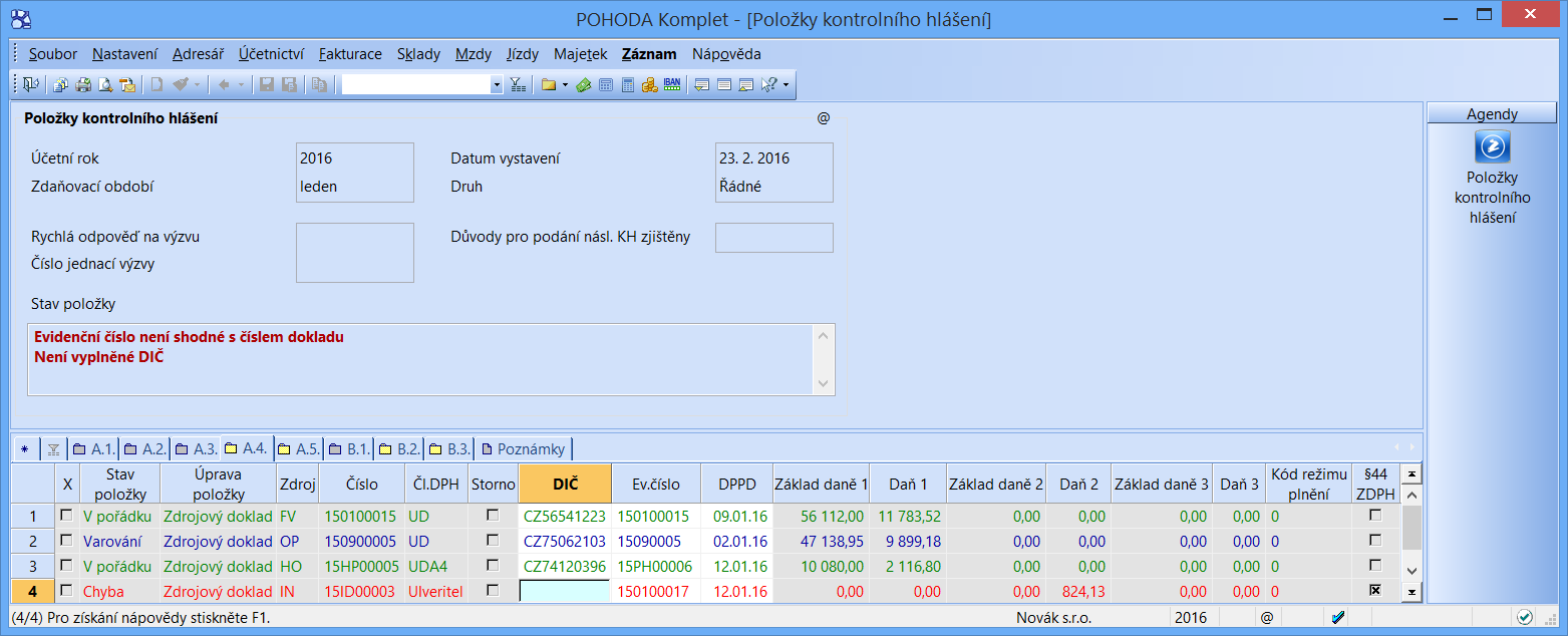 V agendě Položky kontrolního hlášení provádí POHODA kontroly a zjišťuje, zda jsou načtené záznamy správně zadané. Chybně vyplněnou položku označí červeně, popřípadě zobrazí ve formuláři agendy varování s popisem upozornění. Pokud v sestaveném hlášení najdete chybu, která se přenesla už z dokladu, doporučujeme upravit daný zdrojový doklad a znovu spustit zpracování Kontrolního hlášení.