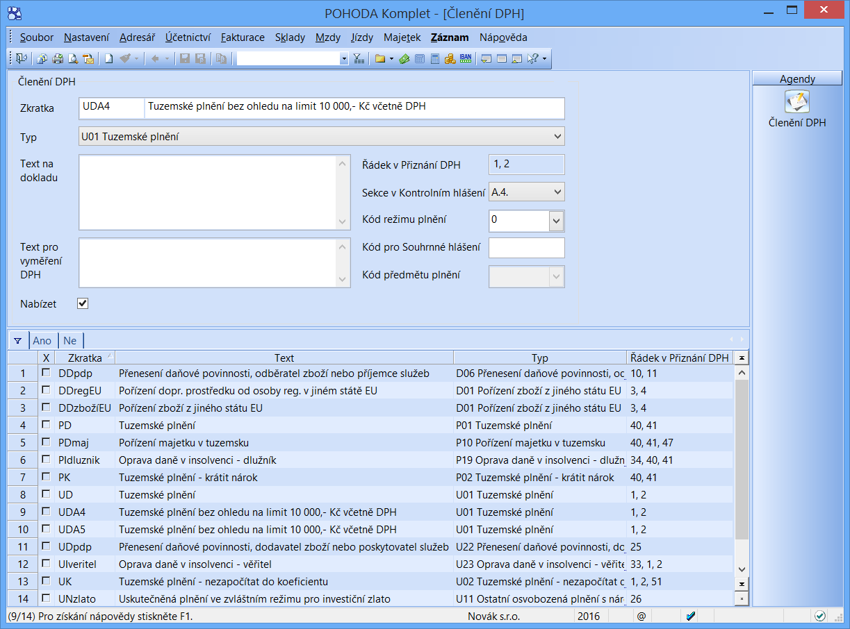 V těchto případech je nutné u dokladu zvolit členění DPH s konkrétní sekcí, např. „UDA5 – Tuzemské plnění bez ohledu na limit 10 000 Kč včetně DPH“ s předvyplněnou částí A.5. Program POHODA v tomto případě limit nekontroluje a doklad zařadí do sekce A.5.