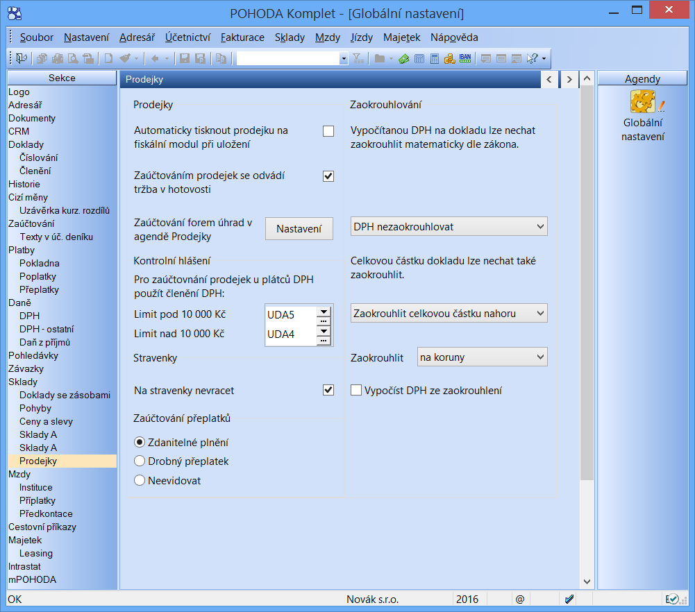Členění DPH pro zaúčtování prodejek si můžete upravit v agendě Globální nastavení/Sklady/Prodejky. Prodejky do limitu 10 000 Kč budou automaticky vstupovat do sekce A.5. a prodejky nad limit do sekce A.4. Pokud častěji prodáváte fyzickým osobám (bez DIČ), doporučujeme změnit členění DPH nad limit na A.5.