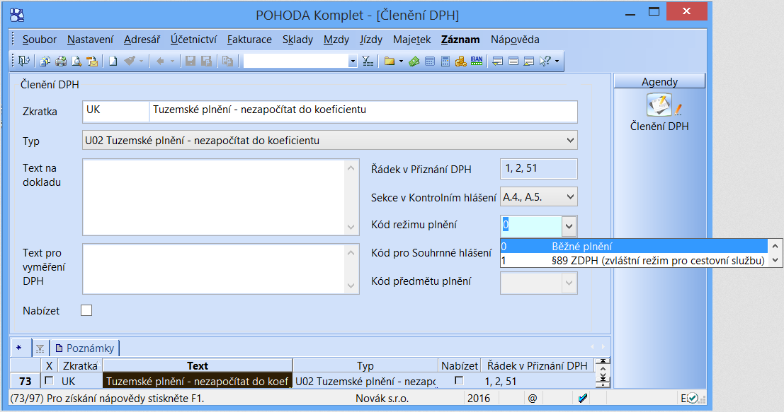Do agendy Členění DPH jsme přidali nové pole Kód režimu plnění, které ovlivní vyplnění stejnojmenného sloupce v sekci A.4. Pole je přístupné pouze u členění DPH s vybranou sekcí kontrolního hlášení (A.4. nebo A.4., A.5.). Jako výchozí je přednastaven kód 0 pro běžné plnění. Dále můžete vybrat kód 1 pro § 89 ZDPH – Zvláštní režim pro cestovní službu, nebo kód 2 pro § 90 ZDPH – Zvláštní režim pro použité zboží. Máte-li více druhů režimu, je nutné na každý kód vytvořit samostatné členění DPH.