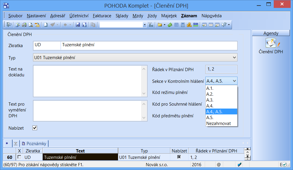 Členění DPH doporučujeme před prvním vystavením kontrolního hlášení zkontrolovat a případně upravit vstup do tohoto hlášení. Samozřejmě můžete vytvořit vlastní členění DPH.
