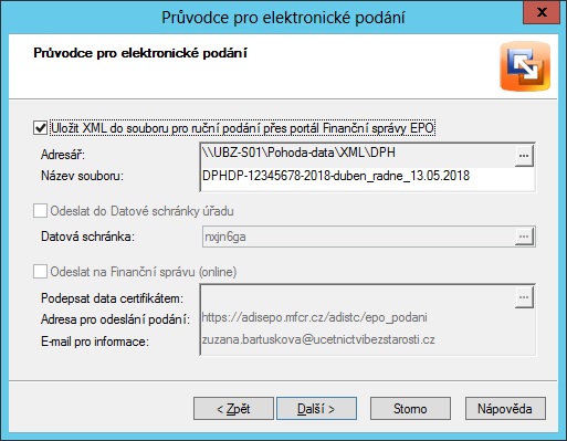 Pokud chceme přiznání pouze uložit v XML formátu, ponecháme zaškrtnutou pouze první volbu Uložit XML do souboru pro ruční podání přes portál Finanční správy EPO. V dalším kroku se nám dále otevře dialogové okno pro odeslání datovou schránkou.