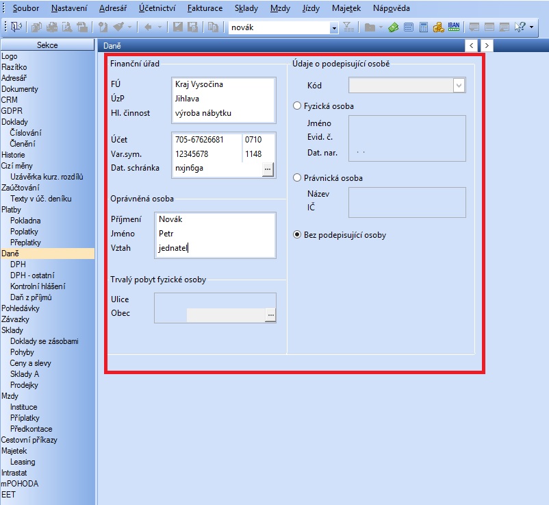 V agendě Globální nastavení/Daně si nastavíme příslušný finanční úřad, číslo účtu pro placení DPH a také údaje o zástupci právnické osoby, popř. zmocněném zástupci pro podávání daňových přiznání.