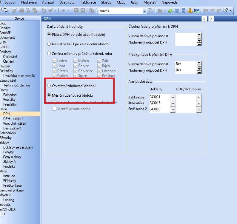 Přiznání se vystavuje měsíční nebo čtvrtletní v souladu s nastavením zdaňovacího období v agendě Globální nastavení (Nastavení/Globální nastavení) na kartě Daně/DPH.