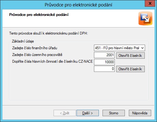 Pro odeslání přiznání (a obdobně též kontrolního hlášení a souhrnného hlášení) použijeme volbu Záznam/Odeslat přiznání k DPH, čímž se nám spustí průvodce elektronickým odesláním. Před prvním odesláním musíme vyplnit číslo finančního úřadu a územního pracoviště a číslo činnosti dle CZ-NACE. Při dalším odesílání si již POHODA nastavení pamatuje.
