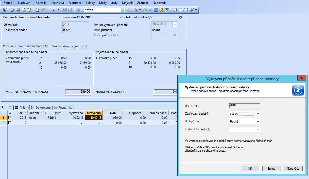 Nastavení finančního úřadu a zdaňovacího období stačí provést pouze jednou na začátku a případně při změně údajů. Pokud máme správně nastavené údaje o přiznání, můžeme vytvořit nové přiznání v agendě Účetnictví/Daň z přidané hodnoty/Přiznání DPH.