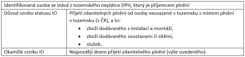Tab. 1: Vznik statusu identifikované osoby – přijetí vybraných zdanitelných plnění od osoby neusazené v tuzemsku