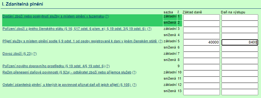 Obchodní společnost Alfa, s. r. o., právnická osoba povinná k dani, ale neplátce DPH, přijala dne 6. září 2020 službu (odborné poradenství) v hodnotě 40 000 Kč od slovenské firmy, která je osobou povinnou k dani na Slovensku, osobou osvobozenou – neplátcem DPH, na Slovensku, osobou neregistrovanou k dani na Slovensku. Poradenství bylo poskytnuto při osobní návštěvě vedení společnosti Alfa, s. r. o. u poskytovatele služby na Slovensku.