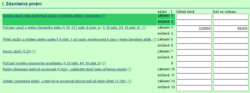 Za měsíc červen musí podat přiznání k DPH jako identifikovaná osoba, kde v oddíle I – zdanitelná plnění, na řádek 3 uvede jako základ daně částku 330 000 Kč, daň na výstupu sám vyčíslí ve výši 69 300 Kč, tj. 21 % (předpokládáme, že pořídil zboží v základní sazbě DPH). Žádné jiné daňové tvrzení (souhrnné hlášení či kontrolní hlášení) nepodává. Uvedenou daň také do 25. července 2020 musí uhradit na účet správce daně.