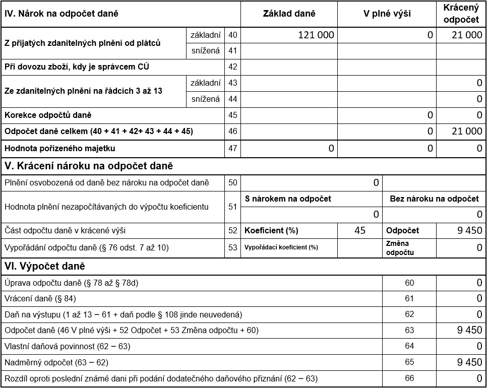 Předpokládejme, že plátce daně nakoupí „běžné“ zboží za 121 000 Kč bez DPH a pro zjednodušení nemá v tomto období žádné výstupy/plnění. V daňovém přiznání k DPH uvede klasicky základ daně na ř. 40, ale hodnotu DPH (21 000 Kč) uvede na tomto řádku ve sloupci „krácený nárok“. Hodnota DPH ze sloupce „krácený nárok“ se vynásobí koeficientem (který jsme uvedli na ř. 52) a z původní hodnoty DPH na vstupu 21 000 Kč má plátce nárok na odpočet daně jen ve výši 9 450 Kč (21 000 × 45 / 100).