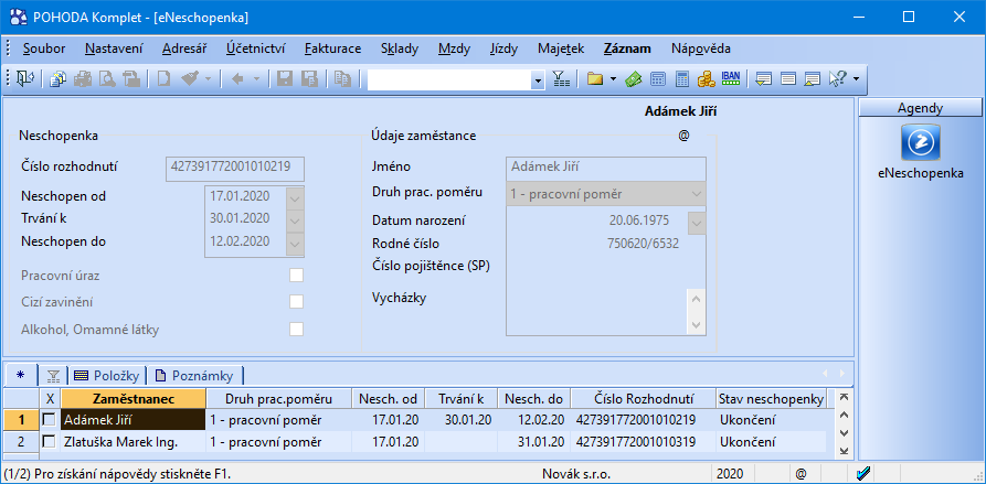 Samotné údaje o pracovní neschopnosti zaměstnance uvidíte na záložce Položky, kde se z importované eNeschopenky vytvoří záznam s typem neschopenky, a to Vznik, Trvání, resp. Ukončení DPN.