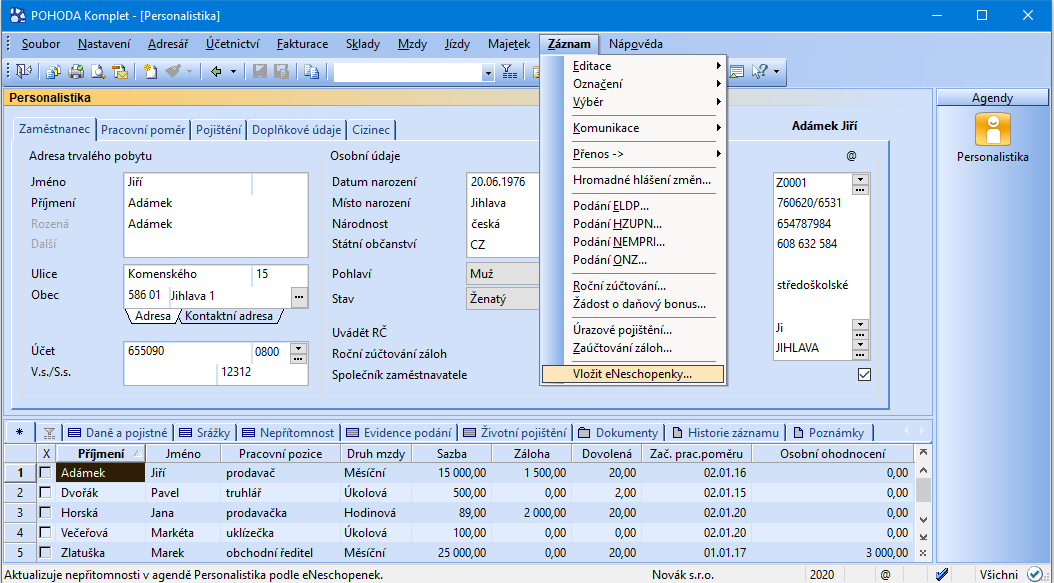 Obr.: Pro promítnutí eNeschopenky do nepřítomností začněte v agendě Personalistika povelem Vložit eNeschopenky…