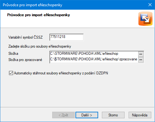 Poté stačí nechat zatrženou volbu Automaticky stáhnout soubory eNeschopenky z podání DZDPN, která zajistí ověření stavu Vašeho podání a zároveň v případě přijatého stavu bez chyb provede stažení XML souborů s eNeschopenkami do Vámi přednastavené složky. Na další straně průvodce budete informováni o výsledku stažení eNeschopenky z podání DZDPN.