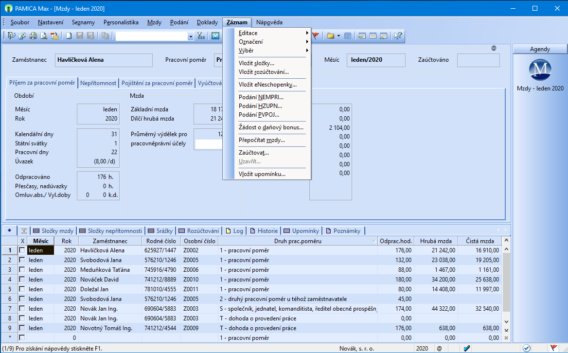 Obr.: Pro hromadné vytvoření nepřítomnosti z eNeschopenek do mezd příslušného měsíce, stačí zvolit povel Záznam/Vložit eNeschopenky…