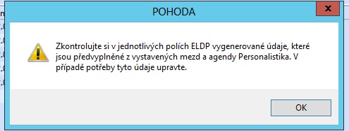 Generování ELDP spustíme povelem Záznam/Podání ELDP. POHODA nám zobrazí informaci o počtu generovaných ELDP. Pokud vše souhlasí, můžeme potvrdit ANO. ELDP se vygenerují a zobrazí se nám upozornění.