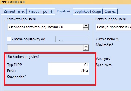 Před samotným sestavení ELDP si nejprve musíme zkontrolovat vyplnění typu ELDP v agendě Personalistika v programu POHODA. U jednotlivých zaměstnanců přejdeme na záložku Pojištění a do části Důchodové pojištění. Zde zkontrolujeme a případně opravíme nebo doplníme Typ ELDP následovně: