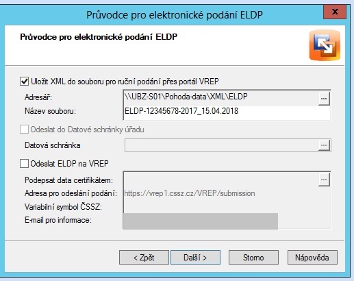 Pro elektronické podání použijeme volbu Záznam/Odeslání ELDP. Po kliknutí na tlačítko Další se nám zobrazí nabídka, zda chceme pouze uložit XML (které pak můžeme např. nahrát na e-portál ČSSZ), nebo podání odeslat, a to pomocí datové schránky či pomocí elektronického podpisu.