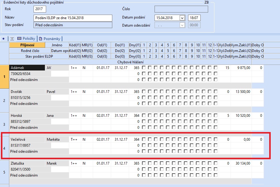 Po jeho potvrzení se dostaneme do agendy Evidenční listy důchodového pojištění, kde máme připravené k podání ELDP pro zaměstnance. Na záložce Položky si můžeme zkontrolovat údaje pro jednotlivé zaměstnance a případně je upravit.