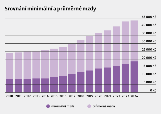 Od ledna letošního roku došlo k navýšení minimální mzdy o 1 600 Kč na 18 900 Kč a aktuálně odpovídá 41,1 % průměrného hrubého výdělku pro letošní rok.