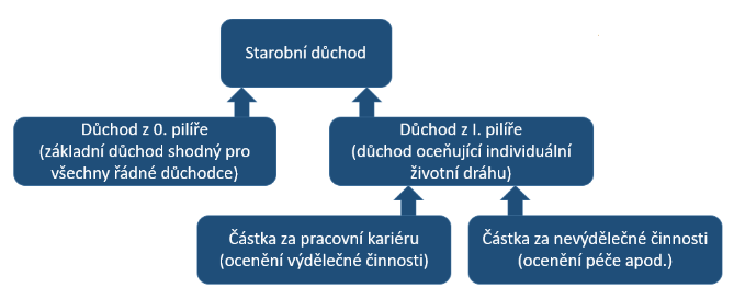 První pilíř bude pracovní kariéru oceňovat stejně jako doposud, ale systém se zjednoduší. Oceňovat bude zejména vyšší příjmy a stejně tak může oceňovat delší dobu strávenou v pracovním procesu. Zásluhovost však není jen o výši příjmů. V prvním pilíři bude také oceněna péče o děti. K důchodu bude připočten pevný bonus za každé dítě. Tento nástroj využijí i ti, kteří jsou již nyní v důchodu.