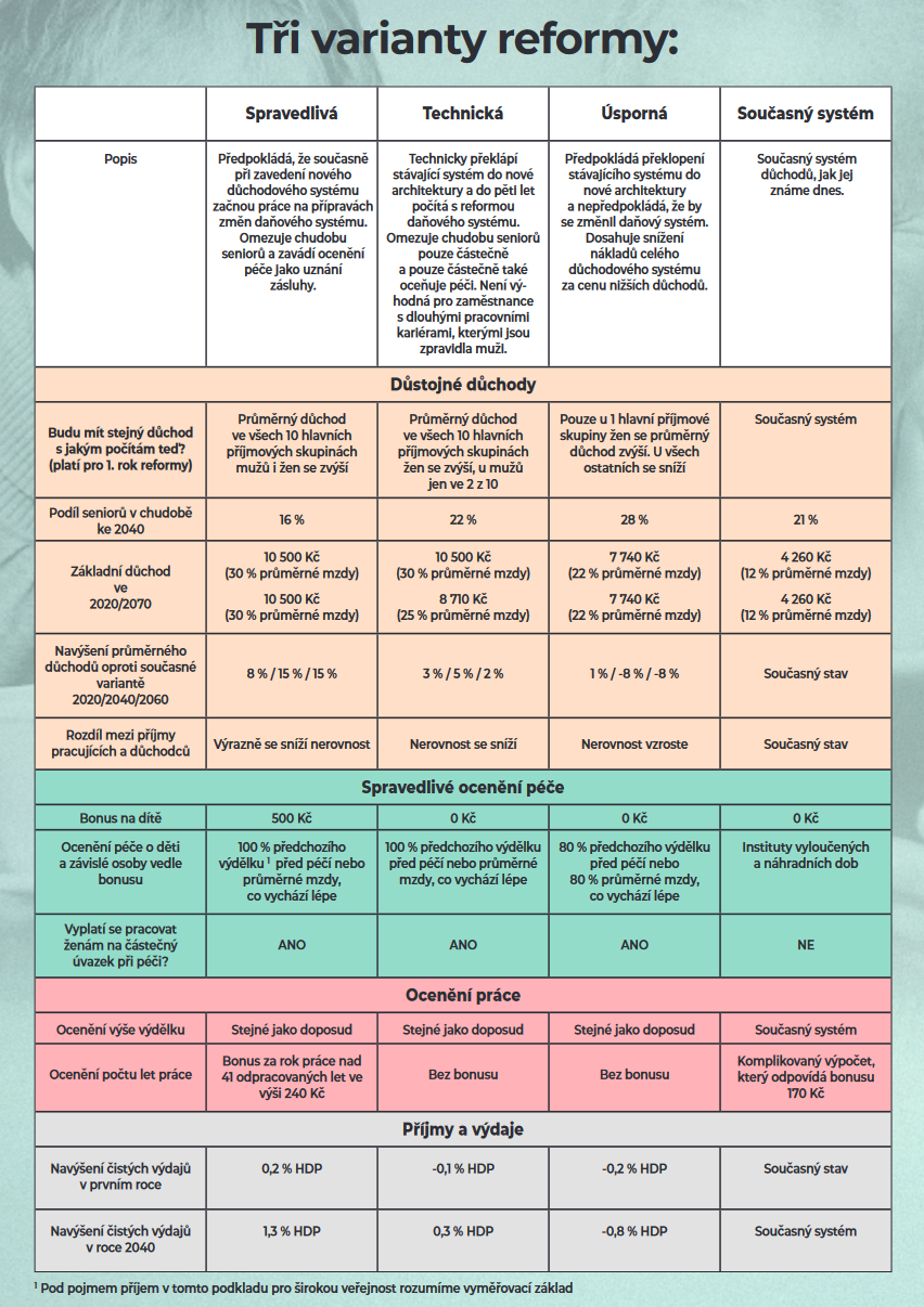 - Spravedlivá varianta – omezuje chudobu seniorů a zavádí ocenění péče jako uznání zásluhy. Předpokládá, že současně při zavedení nového důchodového systému začnou práce na přípravách změn daňového systému.