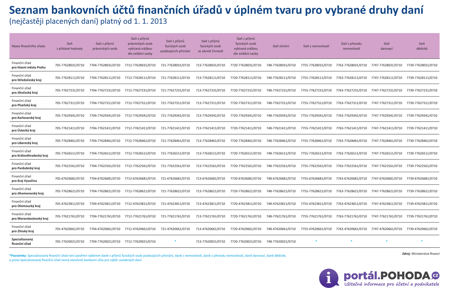 Tab.: Seznam bankovních účtů finančních úřadů pro vybrané druhy daní