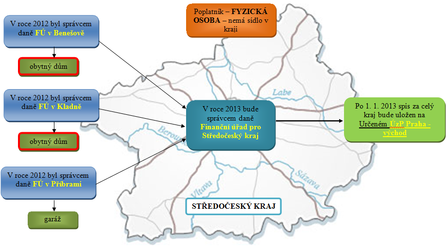 Po 1. 1. 2013 se stane správcem daně z nemovitostí u všech jím v příslušném kraji vlastněných nemovitostí Finanční úřad pro Středočeský kraj a spis, sloučený ze všech původních FÚ, bude uložen na spravujícím ÚzP. Spravující ÚzP je určeno dle příslušnosti podle druhu stavby. Nejvyšší prioritu má v daném případě byt, a proto spravujícím ÚzP bude ÚzP v Příbrami.
