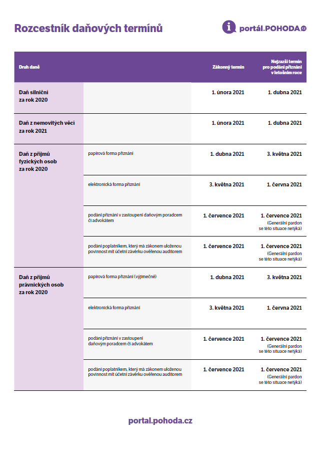 Také se letos ztrácíte v termínech ohledně podání daňových přiznání a nejste si jistí, jaké přiznání a kdy podat? Abychom vám situaci trochu ulehčili, připravili jsme pro vás praktickou tabulku s přehledem termínů.