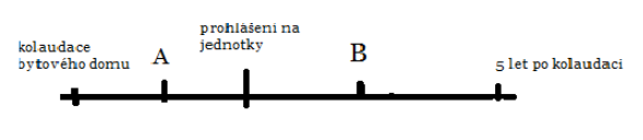 Pokud byl dům rozčleněn na jednotky a vlastnické právo k nim by bylo nabýváno do 5 let od kolaudace bytového domu (nabytí B), v době nabytí nové jednotky se bude jednat o jednotku v nové stavbě bytového domu, proto lze osvobození uplatnit.